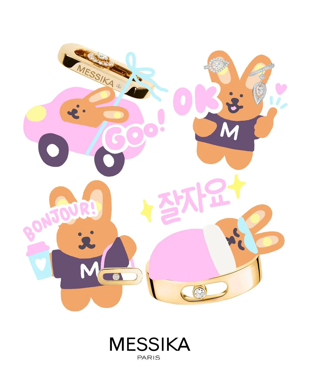 illustration — GIF — JoaillerieCréation d’une mascotte Messika et dessins d’emoji Kakaotalk pour la communication de la marque Messika en Corée.